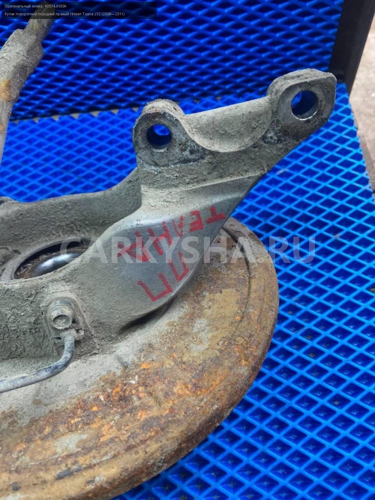 Nissan Teana J32, кулак поворотный передний правый\nАртикул: 7380\n\nОриг. номер: 40014JN00A\nПроизводитель: NISSAN\nПримечание:Ниссан Теана J32, кулак поворотный передний правый, б/у. \n\nМарка: Nissan\nМодель: Teana J32 (2008—2011)\nГод выпуска: 2010\nКузов тип: Седан\nДвигатель номер: VQ35DE\nМодель двигателя: инжектор\nОбъем: 3.5\nТопливо: Бензин\nКоробка: Вариатор\nЦвет: B20-BLUEISH BLACK\nПраво/Лево: Право\nПеред/Зад: Перед\nСовместимости: Nissan Teana J32 (2008—2011) 3.5 CVT (249 л.с.)\nСовместимость: