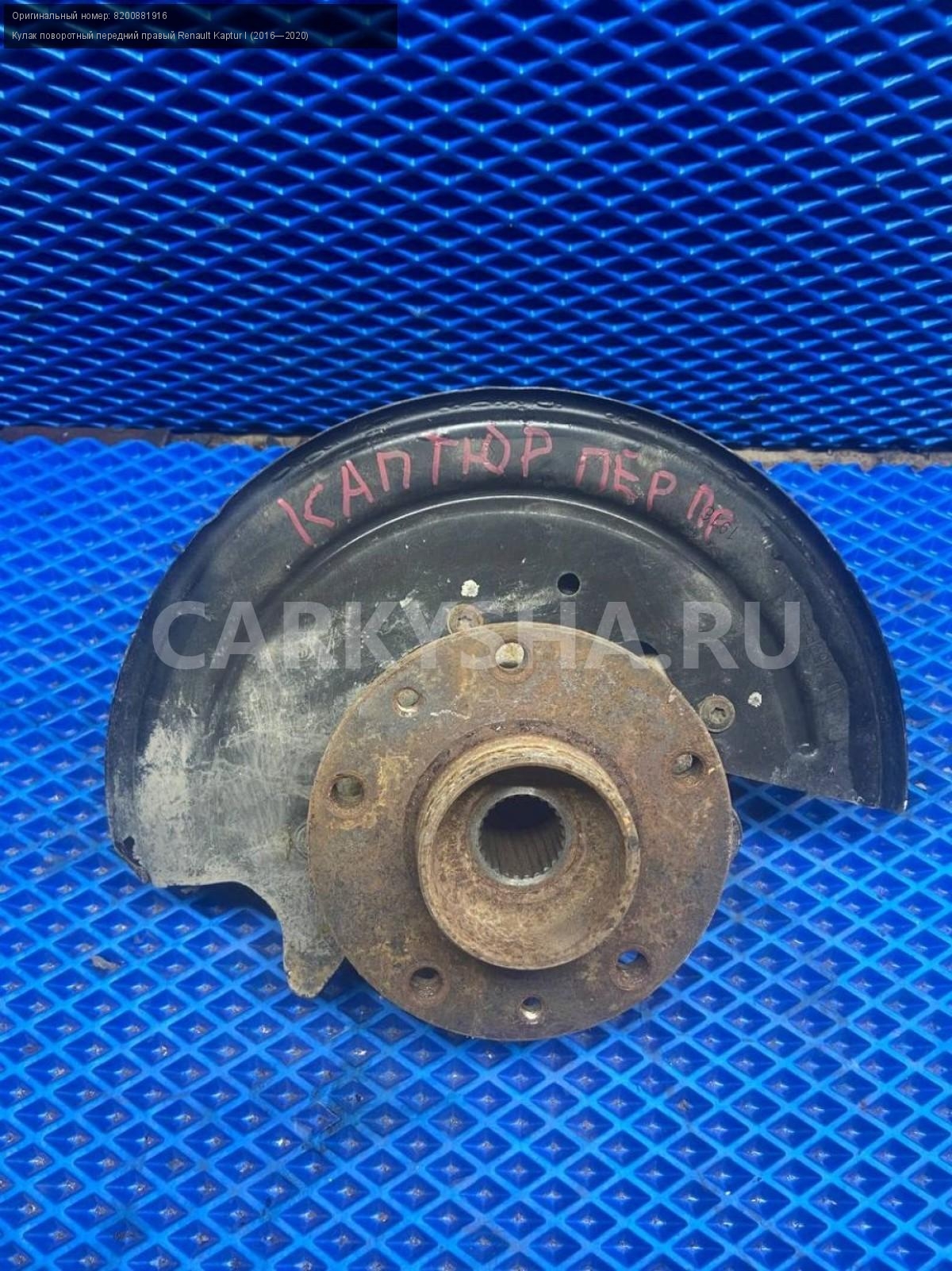 Renault Kaptur, кулак поворотный передний правый.\nАртикул: 7878\n\nОриг. номер: 8200881916\nПроизводитель: RENAULT\nПримечание:Рено Каптюр, кулак поворотный передний правый, б/у. \n\nМарка: Renault\nМодель: Kaptur I (2016—2020)\nГод выпуска: 2016\nКузов тип: Внедорожник\nДвигатель номер: H4M438\nМодель двигателя: инжектор\nОбъем: 1.6\nТопливо: Бензин\nКоробка: Механика\nЦвет: Белый\nПраво/Лево: Право\nПеред/Зад: Перед\nСовместимости: Renault Kaptur I (2016—2020) 1.6 MT (114 л.с.)\nСовместимость: