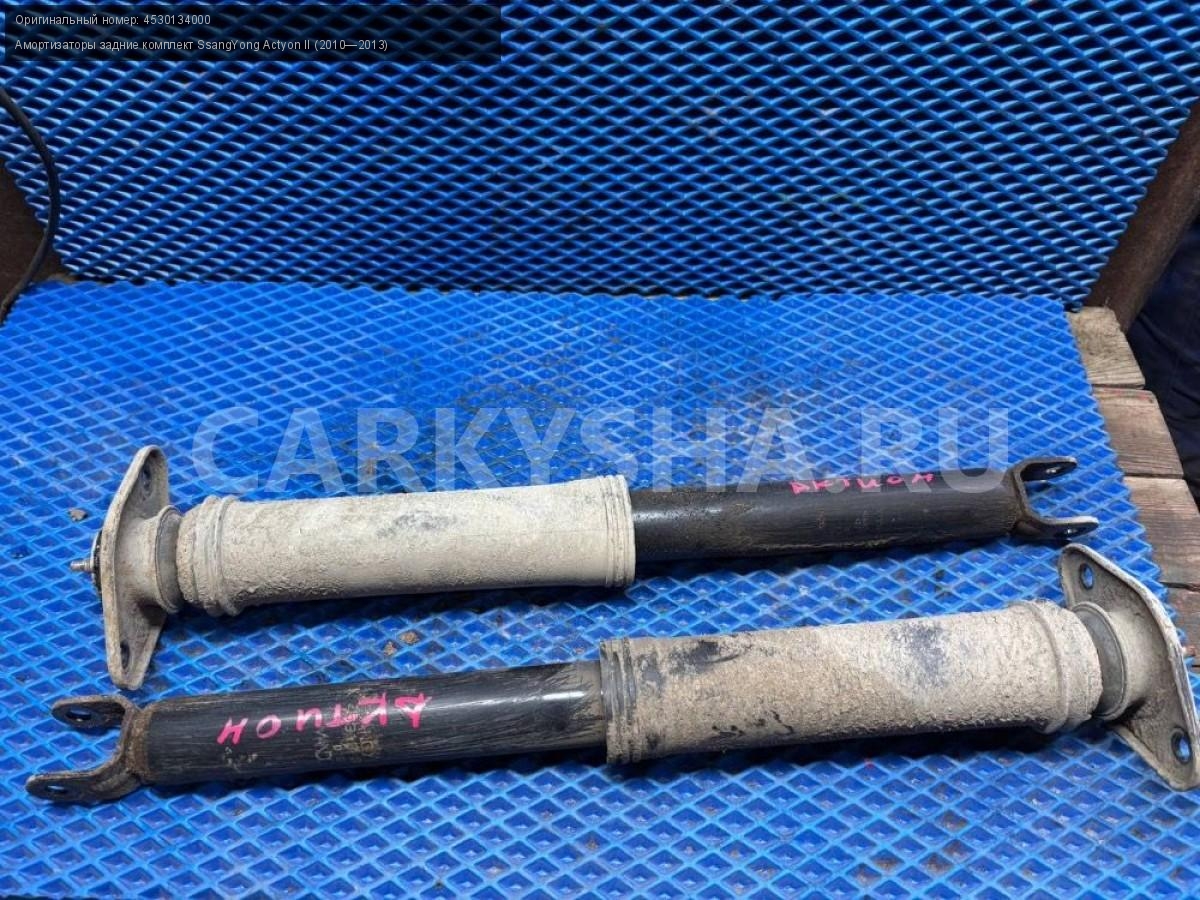 SsangYong Actyon New, амортизаторы задние пара.\nАртикул: 9290\n\nОриг. номер: 4530134000\nПроизводитель: SSANG YONG\nПримечание:СсангЕнг Актион Нью , амортизаторы задние , цена за пару , б/у. \n\nМарка: SsangYong\nМодель: Actyon II (2010—2013)\nГод выпуска: 2011\nКузов тип: Внедорожник\nДвигатель номер: D20DTF\nМодель двигателя: турбо-дизель\nОбъем: 2.0\nТопливо: Дизель\nКоробка: Автомат\nЦвет: Серебристый\nПраво/Лево: Право/Лево\nПеред/Зад: Зад\nСовместимости: SsangYong Actyon II (2010—2013) 2.0 D AT (149 л.с.)\nСовместимость:
