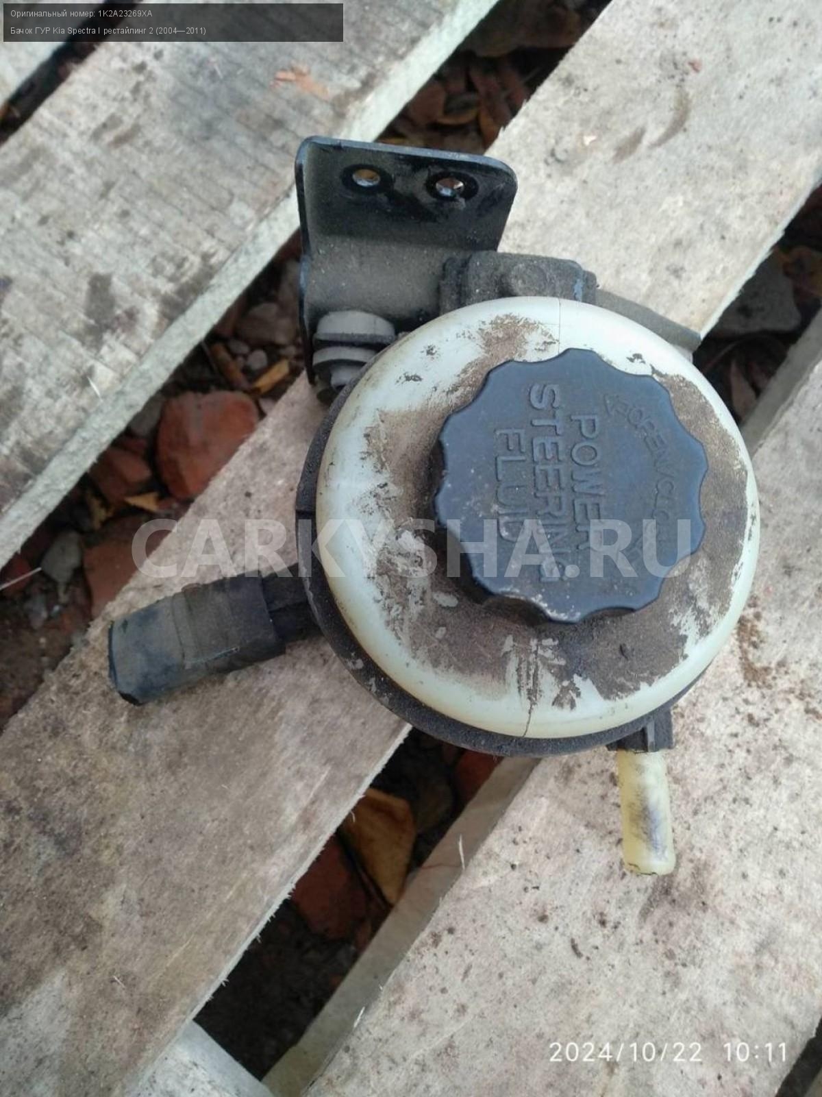 Kia Spectra, бачок гура с кронштейном.\nАртикул: 6043\n\nОриг. номер: 1K2A23269XA\nПроизводитель: Hyundai-KIA\nПримечание:Киа Сректра, бачок гура с кронштейном, б/у. \n\nМарка: Kia\nМодель: Spectra I рестайлинг 2 (2004—2011)\nКузов тип: Седан\nДвигатель номер: S6D\nМодель двигателя: инжектор\nОбъем: 1.6\nТопливо: Бензин\nКоробка: Механика\nЦвет: Серебристый\nСовместимости: Kia Spectra I рестайлинг 2 (2004—2011) 1.6 MT (101 л.с.)\nСовместимость: