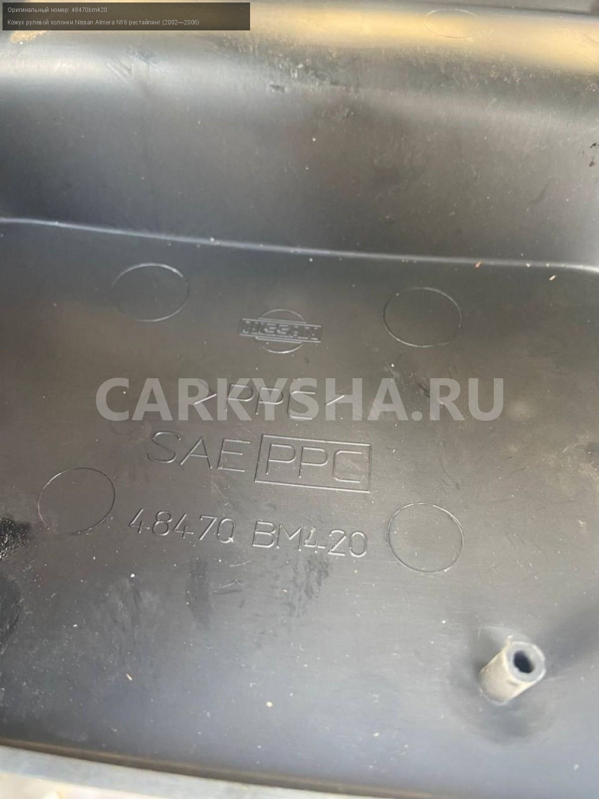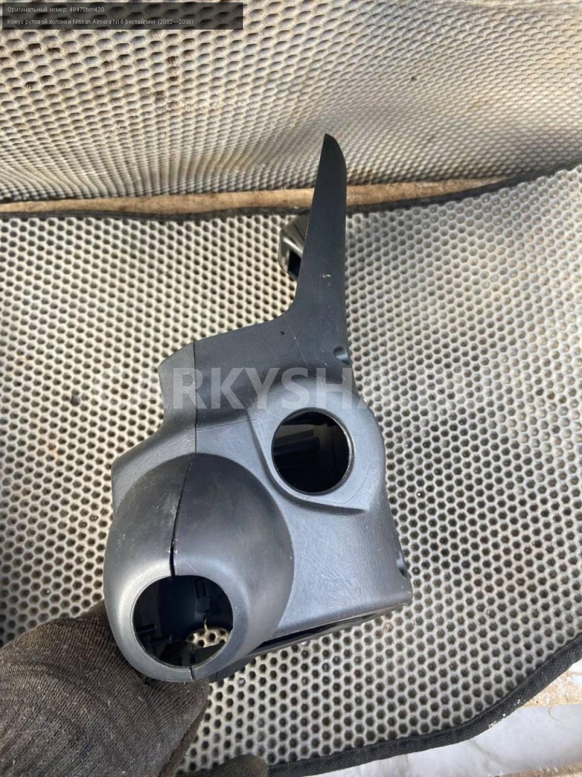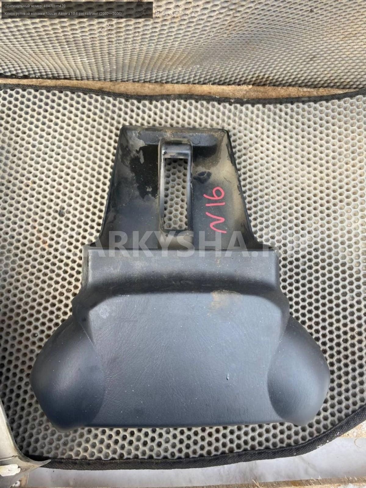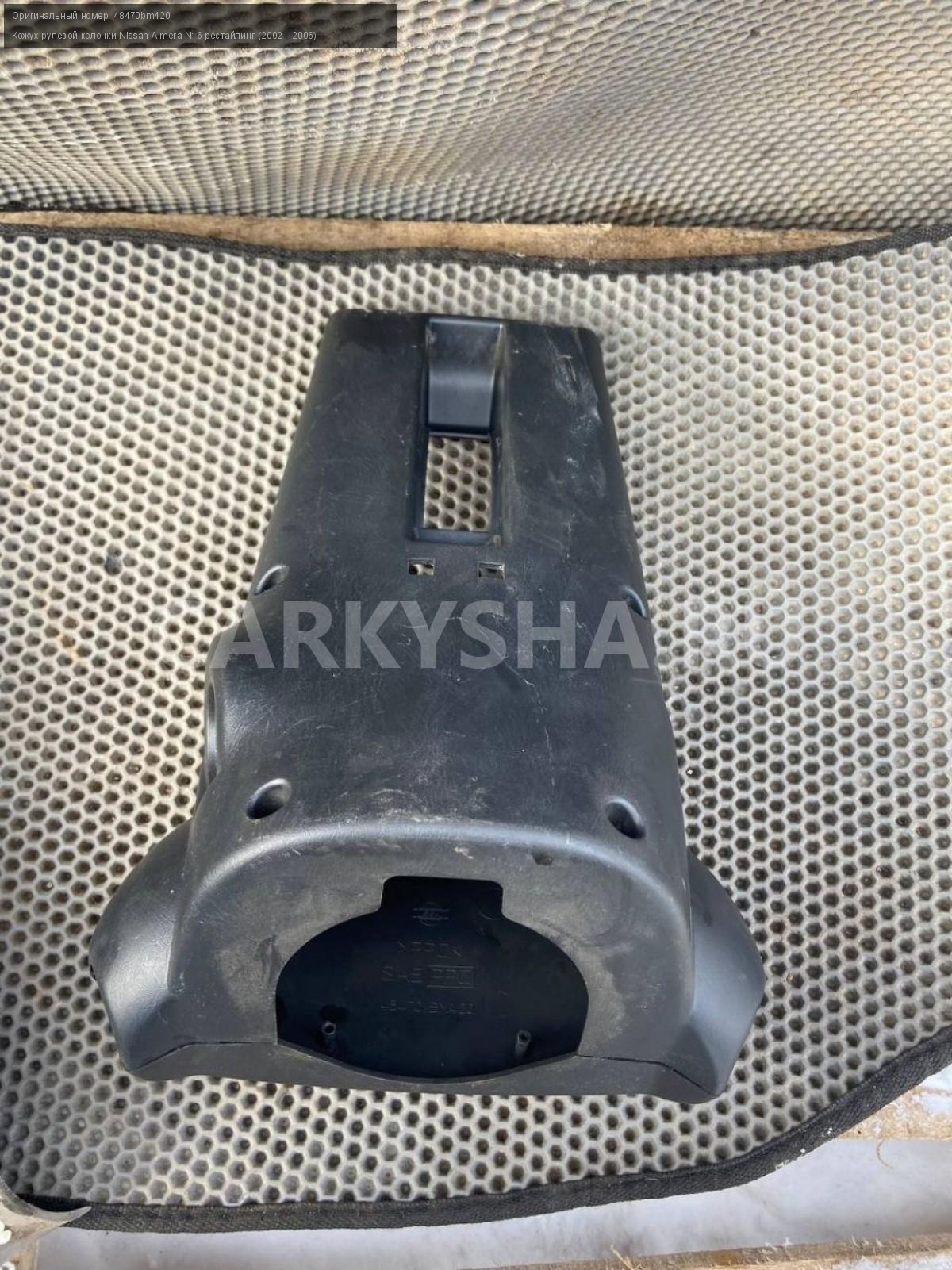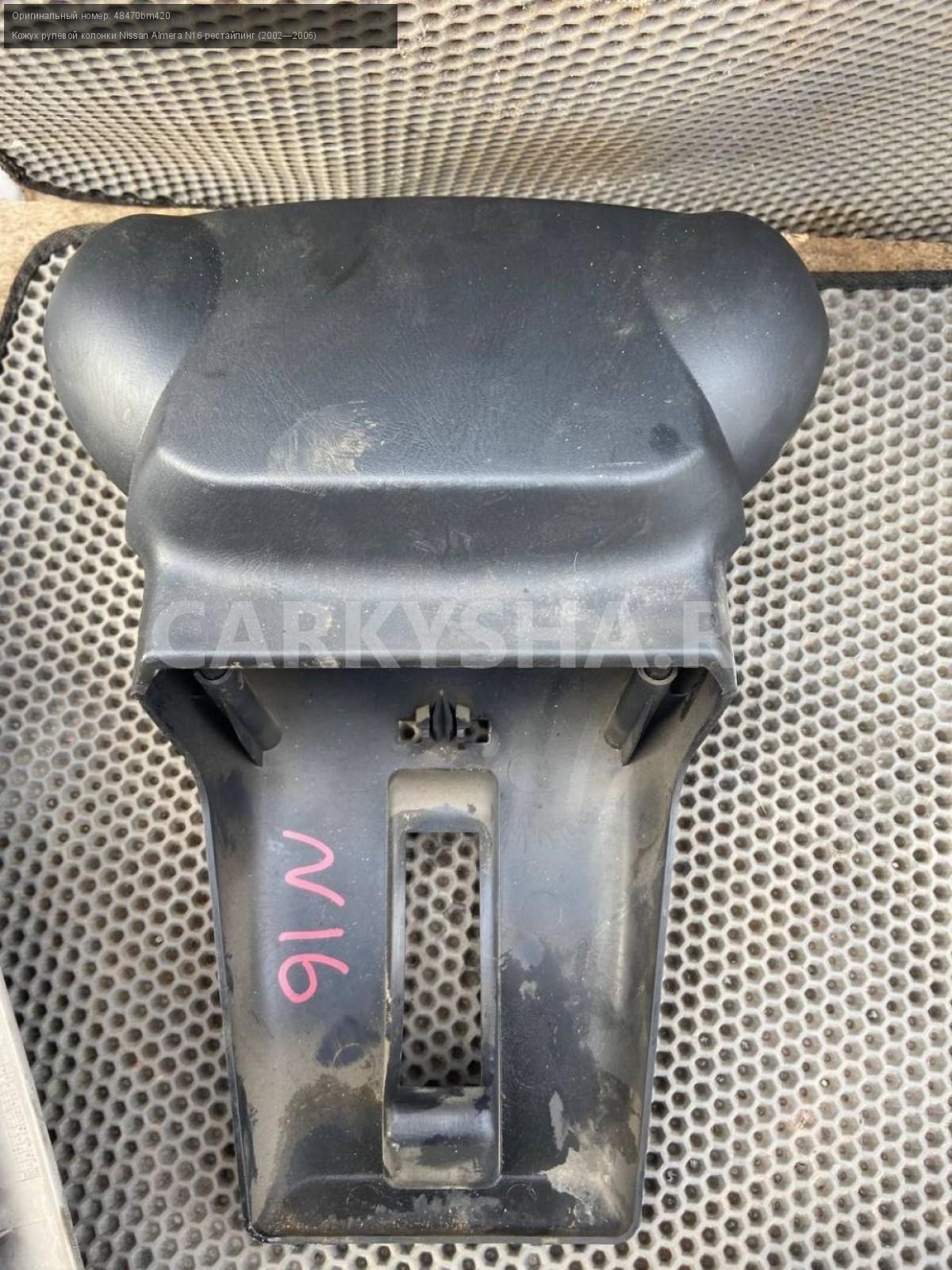 Nissan Almera N16, кожух рулевой колонки.\nАртикул: 7126\n\nОриг. номер: 48470bm420\nПроизводитель: NISSAN\nПримечание:Ниссан Альмера N16, кожух рулевой колонки, б/у. \n\nМарка: Nissan\nМодель: Almera N16 рестайлинг (2002—2006)\nГод выпуска: 2004\nКузов тип: Хетчбэк\nДвигатель номер: QG18DE\nМодель двигателя: инжектор\nОбъем: 1.8\nТопливо: Бензин\nКоробка: Механика\nЦвет: Черный\nСовместимости: Nissan Almera N16 рестайлинг (2002—2006) 1.8 MT (116 л.с.)\nСовместимость:
