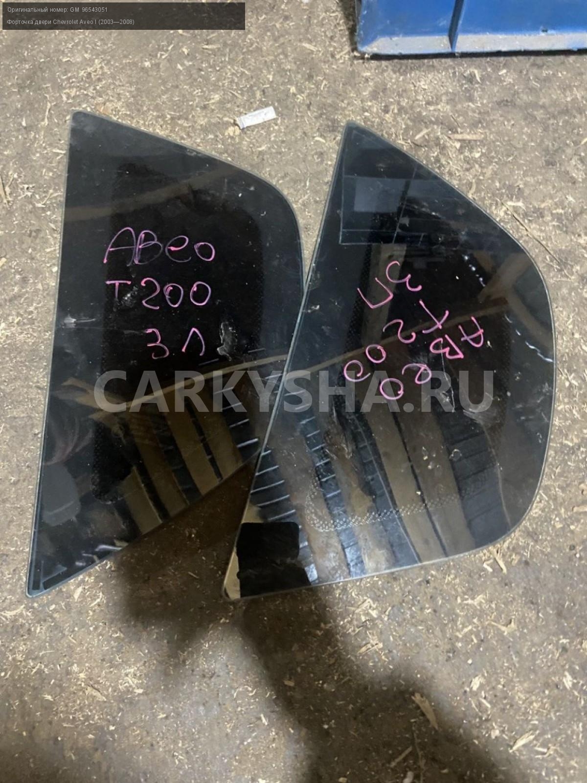 Chevrolet Aveo, Т200, хэтчбек, форточки задние.\nАртикул: 4050\n\nОриг. номер: GM 96543051\nПроизводитель: CHEVROLET\nПримечание:Шевроле Авео Т200, хэтчбек, форточки задние, цена за штуку, бу. \n\nМарка: Chevrolet\nМодель: Aveo I (2003—2008)\nГод выпуска: 2007\nКузов тип: Хетчбэк\nДвигатель номер: B12S1\nМодель двигателя: инжектор\nОбъем: 1.2\nТопливо: Бензин\nКоробка: Механика\nЦвет: Темно-серый\nПраво/Лево: Право/Лево\nПеред/Зад: Зад\nСовместимости: Chevrolet Aveo I (2003—2008) 1.2 MT (72 л.с.)\nСовместимость: