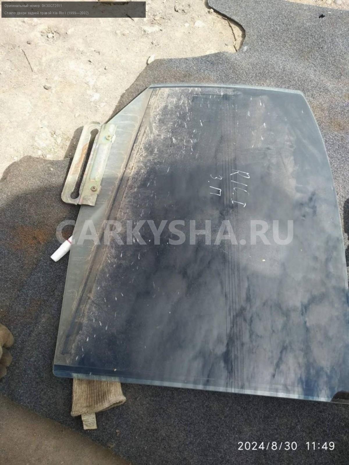 Kia Rio I седан, стекло двери задней правой.\nАртикул: 5606\n\nОриг. номер: 0K30C72511\nПроизводитель: Hyundai-KIA\nПримечание:Киа Рио 1, стекло двери задней правой, б/у. \n\nМарка: Kia\nМодель: Rio I (1999—2002)\nПраво/Лево: Право\nПеред/Зад: Зад\nСовместимости: Kia Rio I (1999—2002)\nСовместимость:
