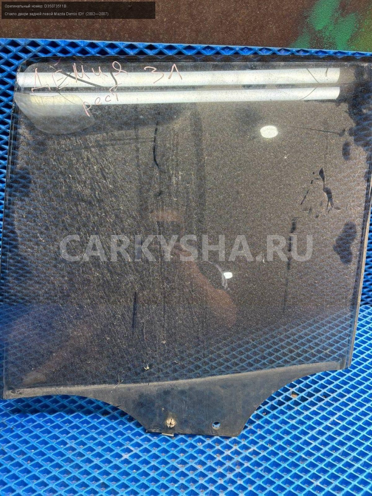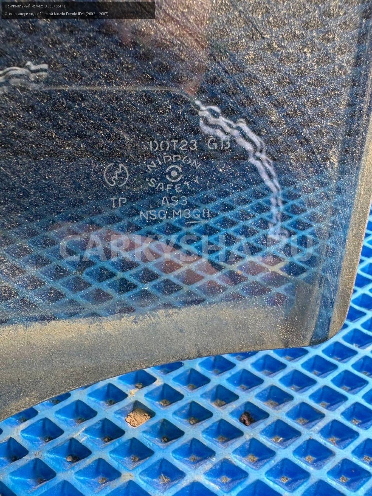 Mazda Demio DY3, стекло двери задней левой.\nАртикул: 8493\n\nОриг. номер: D35073511B\nПроизводитель: MAZDA\nПримечание:Мазда Демио DY3, стекло двери задней левой, б/у. \n\nМарка: Mazda\nМодель: Demio IDY (2002—2007)\nГод выпуска: 2003\nКузов номер: DY3W254283\nКузов тип: Хетчбэк\nДвигатель номер: DY3\nМодель двигателя: инжектор\nОбъем: 1.4\nТопливо: Бензин\nКоробка: Автомат\nЦвет: Синий\nПраво/Лево: Лево\nПеред/Зад: Зад\nСовместимости: Mazda Demio IDY (2002—2007) 1.4 AT (91 л.с.)\nСовместимость: