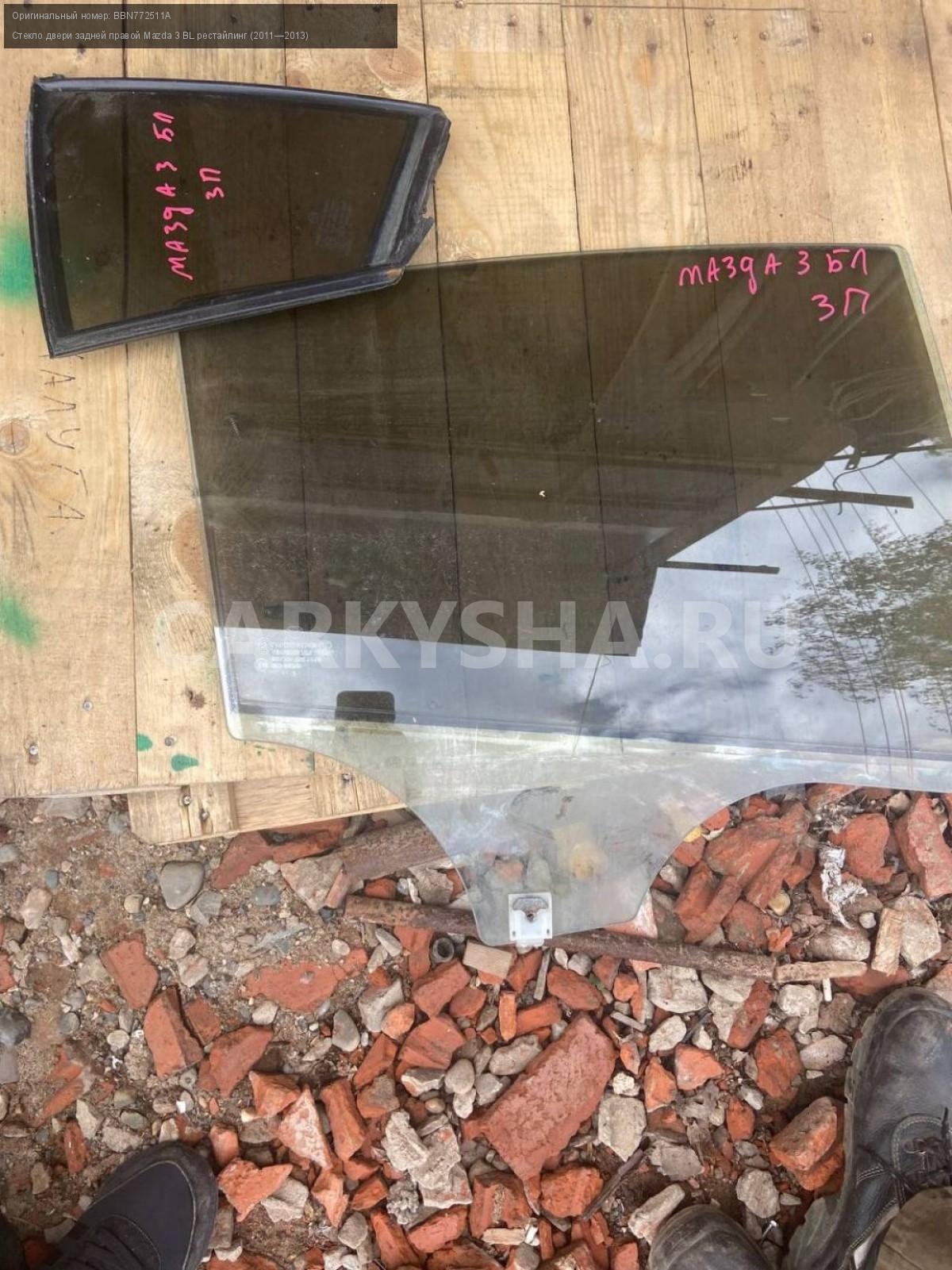 Mazda 3 BL, стекло двери задней правой, форточка.\nАртикул: 5370\n\nОриг. номер: BBN772511A\nПроизводитель: MAZDA\nПримечание:Мазда 3 BL, стекло двери задней правой 2000, форточка 1000, б/у. \n\nМарка: Mazda\nМодель: 3 BL рестайлинг (2011—2013)\nГод выпуска: 2012\nКузов тип: Седан\nДвигатель номер: Z6\nМодель двигателя: инжектор\nОбъем: 1.6\nТопливо: Бензин\nКоробка: Автомат\nЦвет: Темно-Сервй\nПраво/Лево: Право\nПеред/Зад: Зад\nСовместимости: Mazda 3 BL рестайлинг (2011—2013) 1.6 AT (105 л.с.)\nСовместимость: