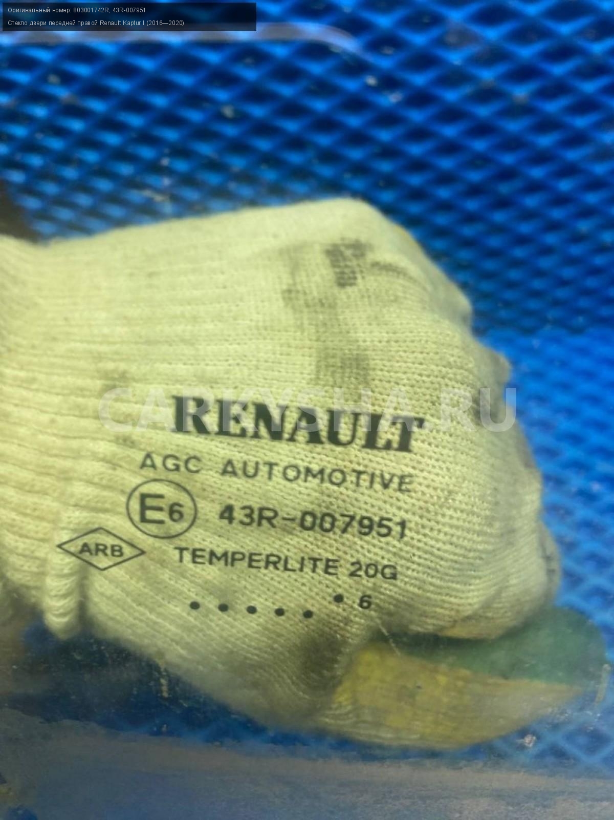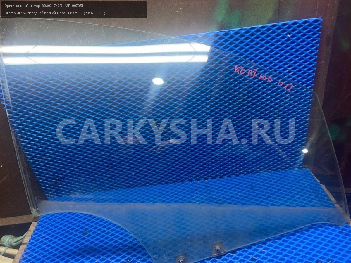 Renault Kaptur , Стекло двери передней правой 2016\nАртикул: 7516\n\nОриг. номер: 803001742R\nНомера замен: 43R-007951\nПроизводитель: RENAULT\nПримечание:Рено Каптюр, стекло двери передней правой , 2016, б/у. \n\nМарка: Renault\nМодель: Kaptur I (2016—2020)\nГод выпуска: 2016\nКузов тип: Внедорожник\nДвигатель номер: H4M438\nМодель двигателя: инжектор\nОбъем: 1.6\nТопливо: Бензин\nКоробка: Механика\nЦвет: Белый\nПраво/Лево: Право\nПеред/Зад: Перед\nСовместимости: Renault Kaptur I (2016—2020) 1.6 MT (114 л.с.)\nСовместимость: